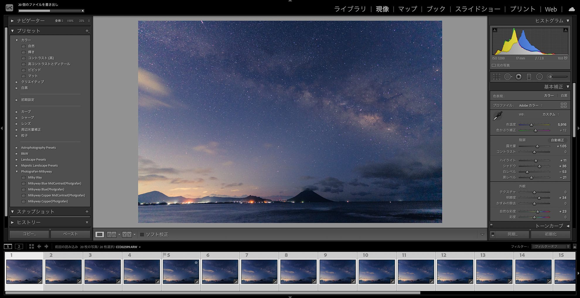 Adobe Lightroom Classicで書き出したTIFF画像20枚。よく見てもらうと初めの数枚にISSの軌跡が映っている。Starry Landscape Stackerでは、飛行機の軌跡などはノイズとして除去することができる。