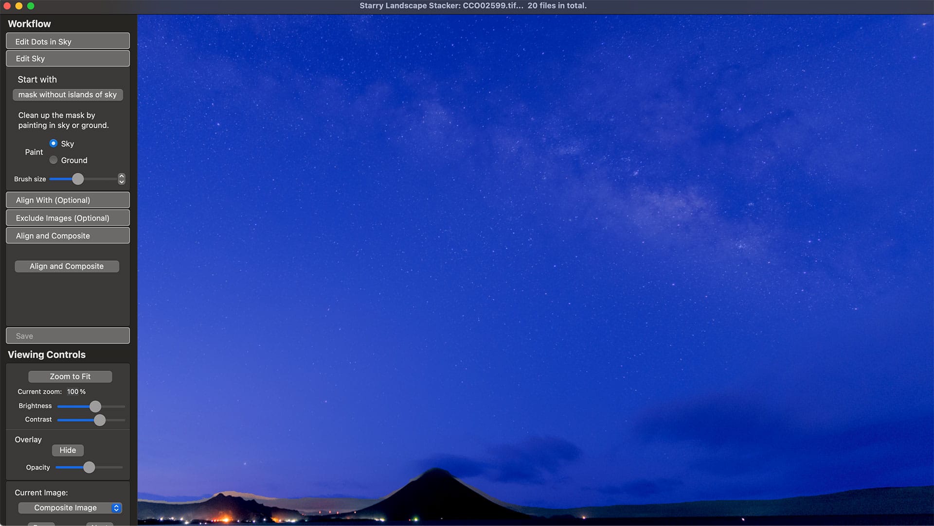 意外と簡単に20枚をコンポジットできる。コンポジットした画像を確認し、空と地面のマスクを納得するまで調整してコンポジットする。